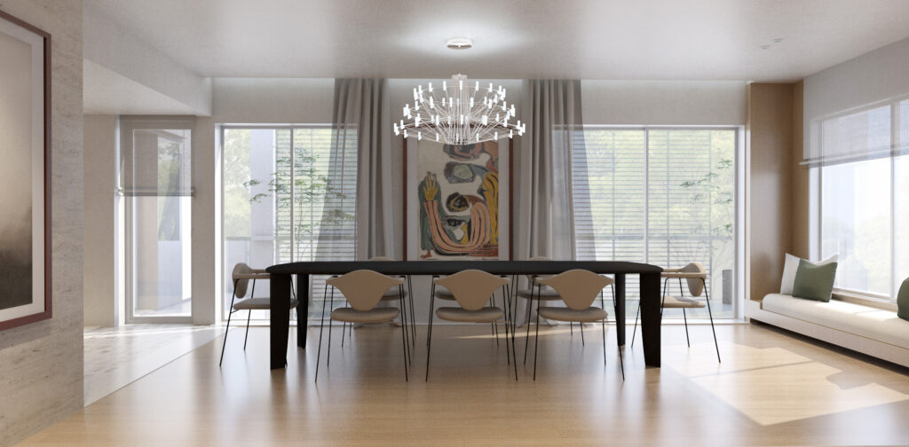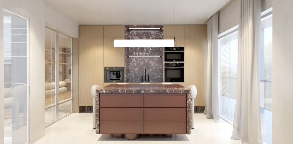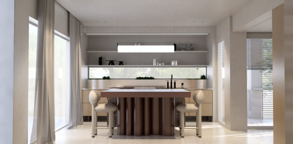 TΟι κύριοι χώροι κατοίκησης στο ισόγειο οργανώνονται ως μια ενιαία χωρική συνέχεια και αναπτύσσονται περιμετρικά του pavé. Τα μεγάλα ανοίγματα ενισχύουν τη σχέση με τον κήπο και επιτρέπουν στο φυσικό φως να διαπερνά τον χώρο, ενώ τα έργα τέχνης εντάσσονται οργανικά στη σύνθεση.