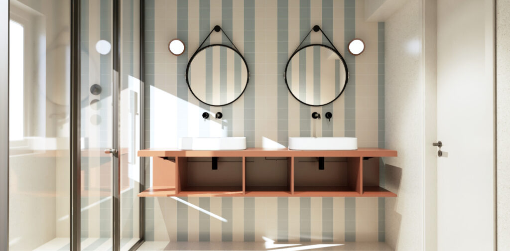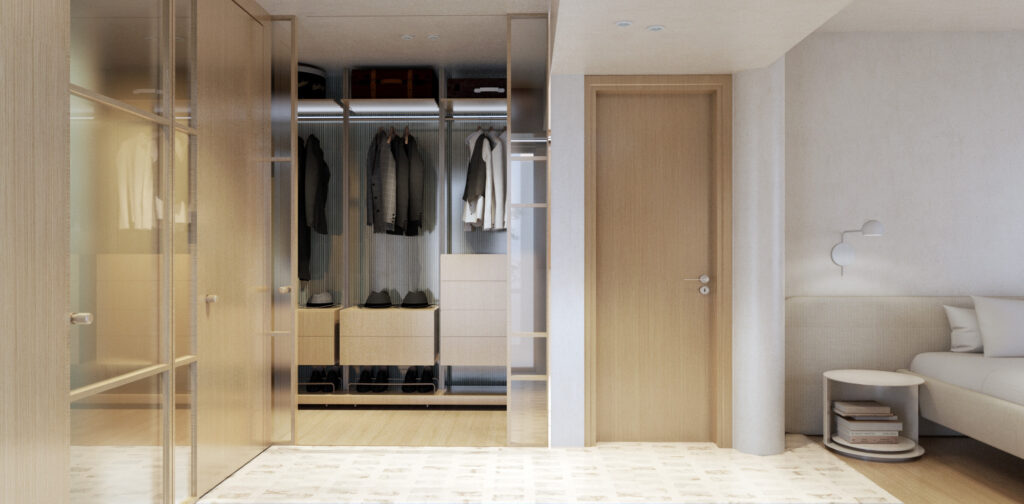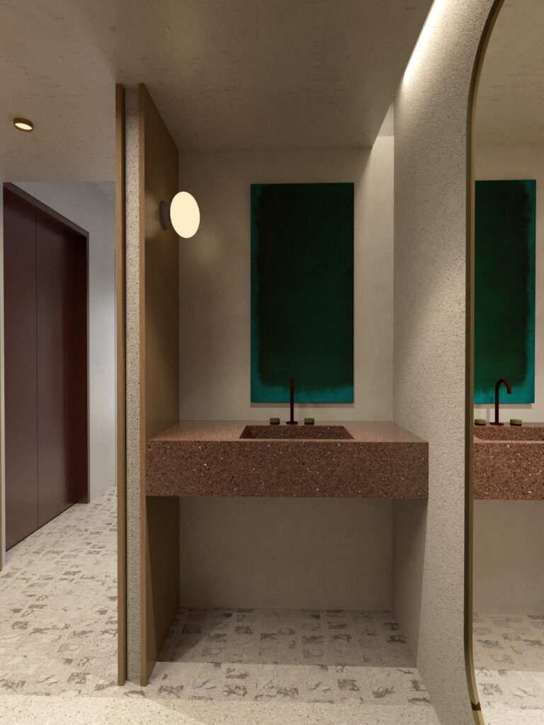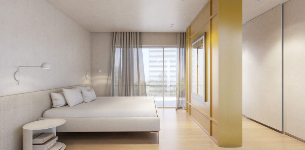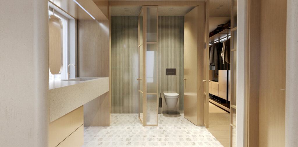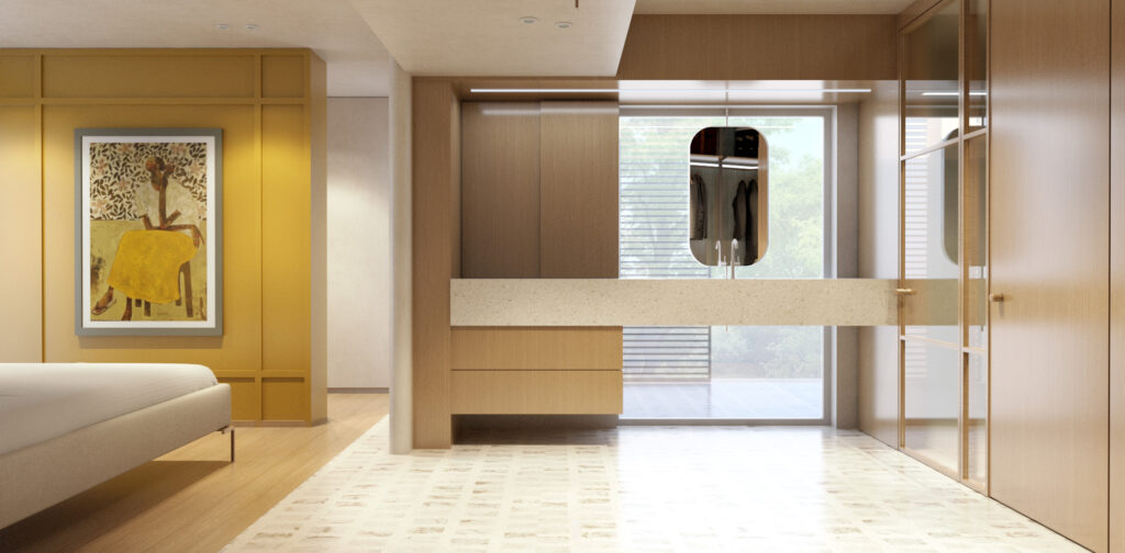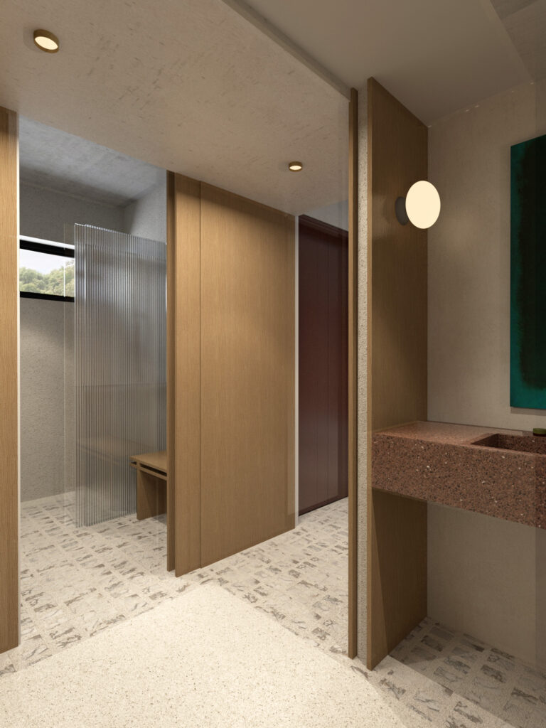 Στον όροφο, η κύρια κρεβατοκάμαρα διαθέτει δύο βεστιάρια και έναν ανοιχτό χώρο λουτρού, όλα ενταγμένα σε μια ενιαία χωρική διάταξη. Το άνοιγμα του νιπτήρα προς το μπαλκόνι και κατ’ επέκταση προς τον κήπο, καθώς και η επανάληψη του pavé, ενισχύουν την αίσθηση της εσωτερικής αυλής και της κατοίκησης σε άμεση σχέση με τη φύση.