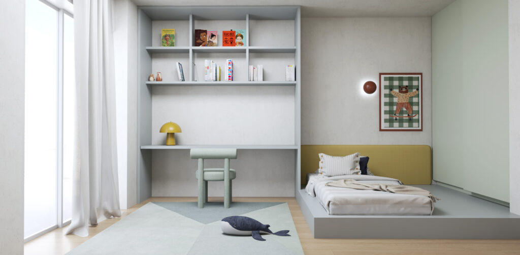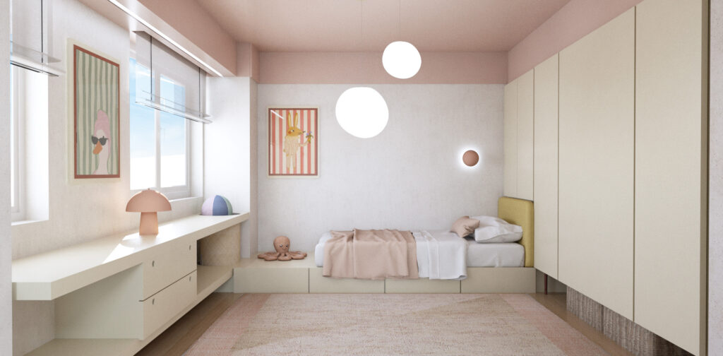 Τα παιδικά δωμάτια οργανώνονται σε αναβαθμούς που λειτουργούν ως χώροι αποθήκευσης, ανατρέποντας τη συμβατική τυπολογία. Ζωηρά χρώματα κυριαρχούν τόσο στα δωμάτια, όσο και στο παιδικό μπάνιο, το οποίο αποτελεί μια παιχνιδιάρικη αναφορά στη ζωή στη θάλασσα.