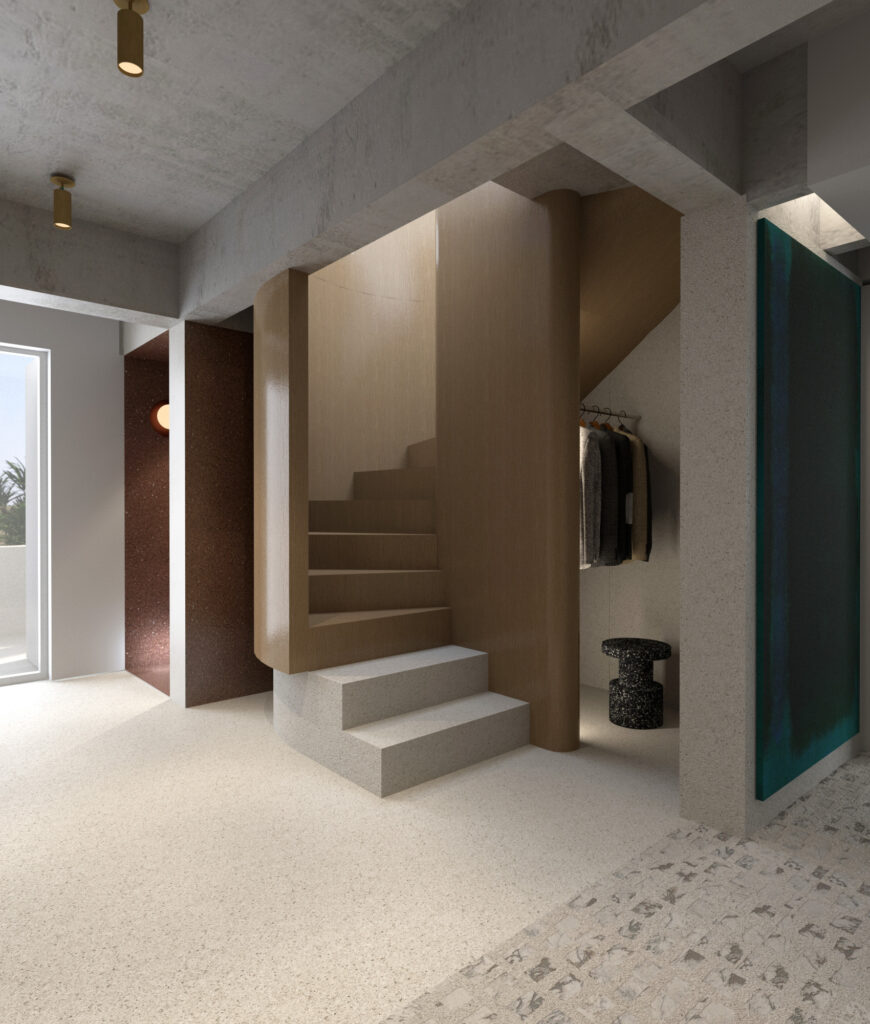 Με αφετηρία την ανάγνωση του κελύφους, το βασικό concept για τους εσωτερικούς χώρους διαμορφώθηκε γύρω από την ιδέα της εσωτερικής αυλής· ενός χώρου που συνεχίζει την εμπειρία του εξωτερικού και δημιουργεί ένα φυσικό περιβάλλον κατοίκησης με άπλετο φως. Η ιδέα αυτή εκφράζεται μέσα από τη χρήση ενός pavé δαπέδου από χυτό τσιμέντο και μικρές μαρμάρινες πλάκες, ένα στοιχείο που εμφανίζεται κυρίως στα σημεία μετάβασης -στις εισόδους και εξόδους του σπιτιού- εκεί όπου ο εσωτερικός χώρος βρίσκεται σε άμεση επαφή με τον κήπο.