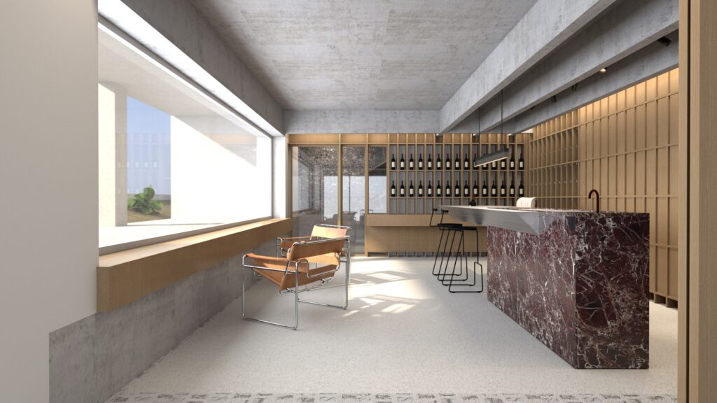 Στο υπόγειο διαμορφώνεται ένας πιο ιδιωτικός χώρος χαλάρωσης, που περιλαμβάνει κελάρι κρασιών, πάγκο οινογνωσίας και προετοιμασίας, καθώς και γυμναστήριο με χώρους ευεξίας. Οι χώροι αυτοί λειτουργούν υποστηρικτικά πριν και μετά τη χρήση της εξωτερικής πισίνας της κατοικίας.